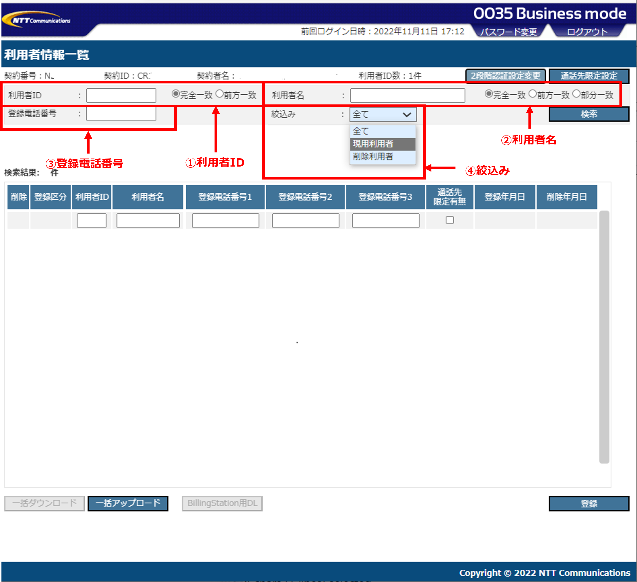| 3.登録電話番号 | ・電話番号を入力します。 ・前方一致検索はできませんので、すべての桁入力が必要です。 |
