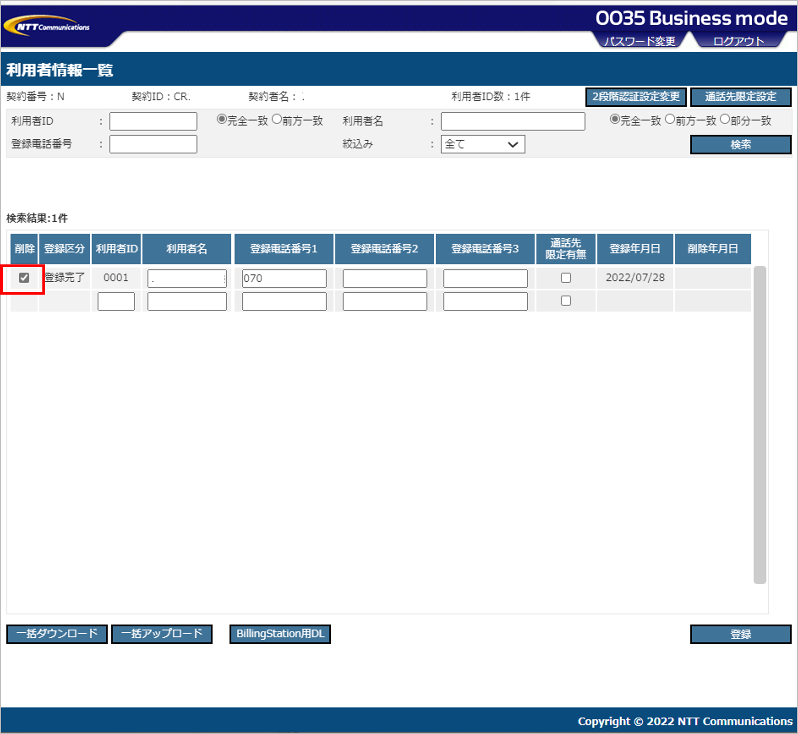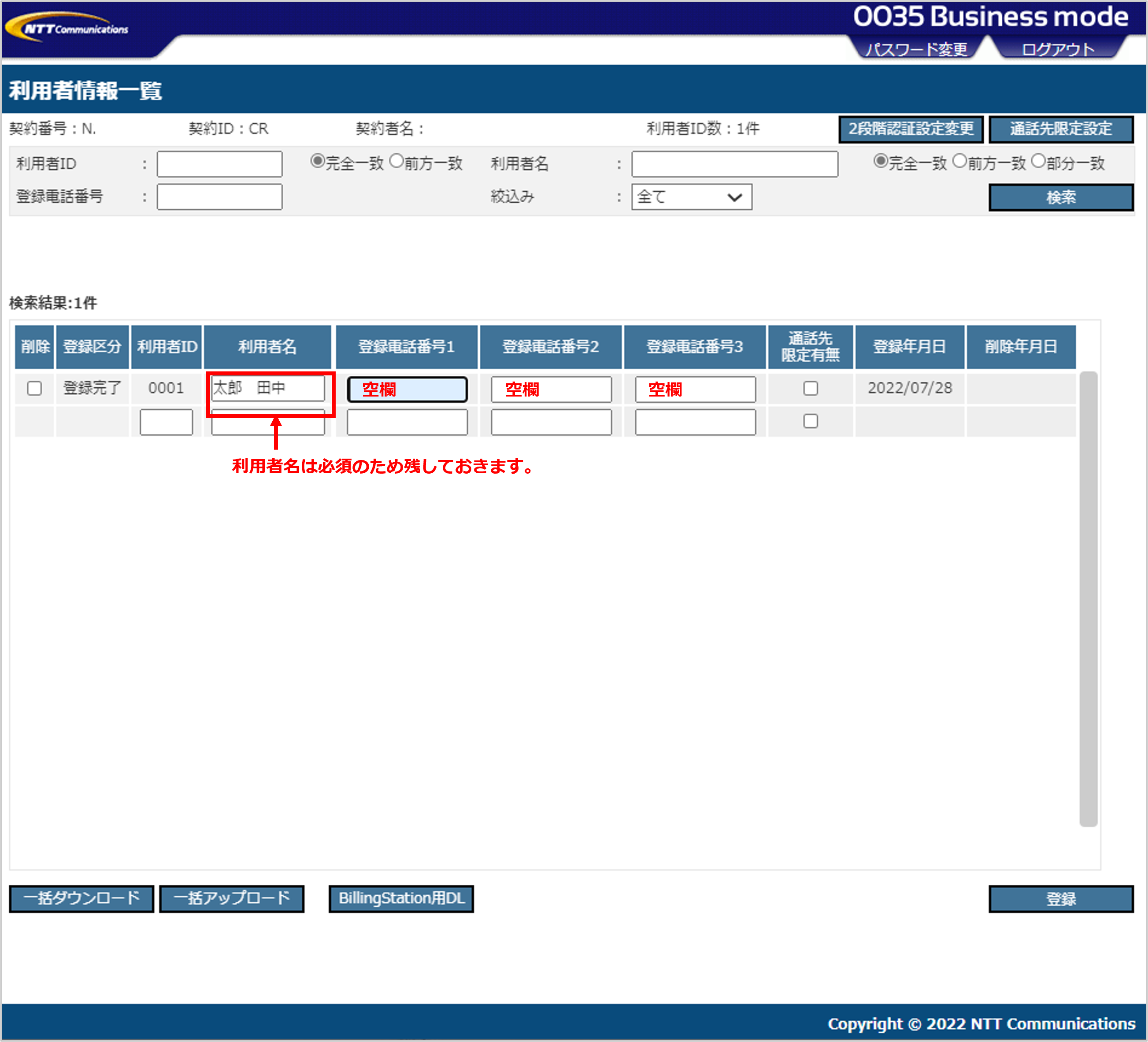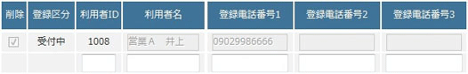 削除する利用者(=電話番号を削除したい利用者)の登録電話番号欄を空欄にし、登録ボタンを押します。