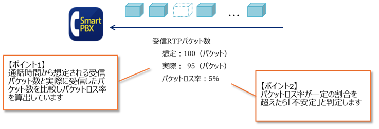 Arcstar Smart PBXでは、通話中のネットワーク状態をリアルタイムで確認しており、通話品質に影響を与えた可能性がある場合、「ネットワーク接続状態が不安定でした」と表示されます。判定には以下の3つの仕組みを用いています。